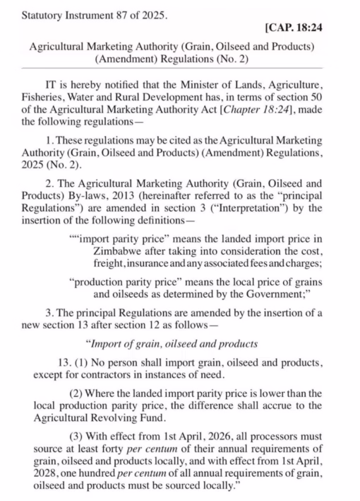By Aldridge Dzvene Zimbabwe has introduced new regulations aimed at strengthening domestic agricultural production and reducing reliance on imports following the gazetting of Statutory Instrument 87 of 2025, which amends the Agricultural Marketing Authority Act [Chapter 18:24]. The new regulations, officially titled the Agricultural Marketing Authority (Grain, Oilseed and Products) (Amendment) Regulations, 2025 (No. 2), […]