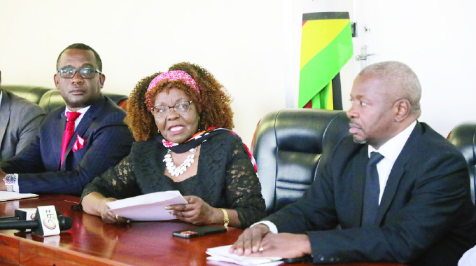 Industry and Commerce Minister Dr Sithembiso Nyoni addresses a press conference, while Permanent Secretary in the Ministry Dr Thomas Utete Wushe (right) and Grain Millers Association of Zimbabwe chairperson Tafadzwa Musarara look on in Harare yesterday. – Picture: Charles Muchakagara